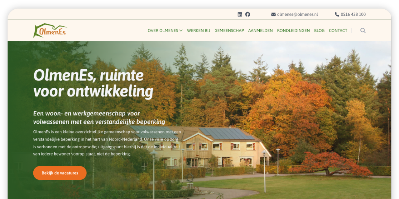 Het was inspirerend om een website te creëren waar toekomstige medewerkers en bewoners écht kunnen ervaren hoe bijzonder OlmenEs is. Het contact met Olmenes was super prettig. Een fijne samenwerking!