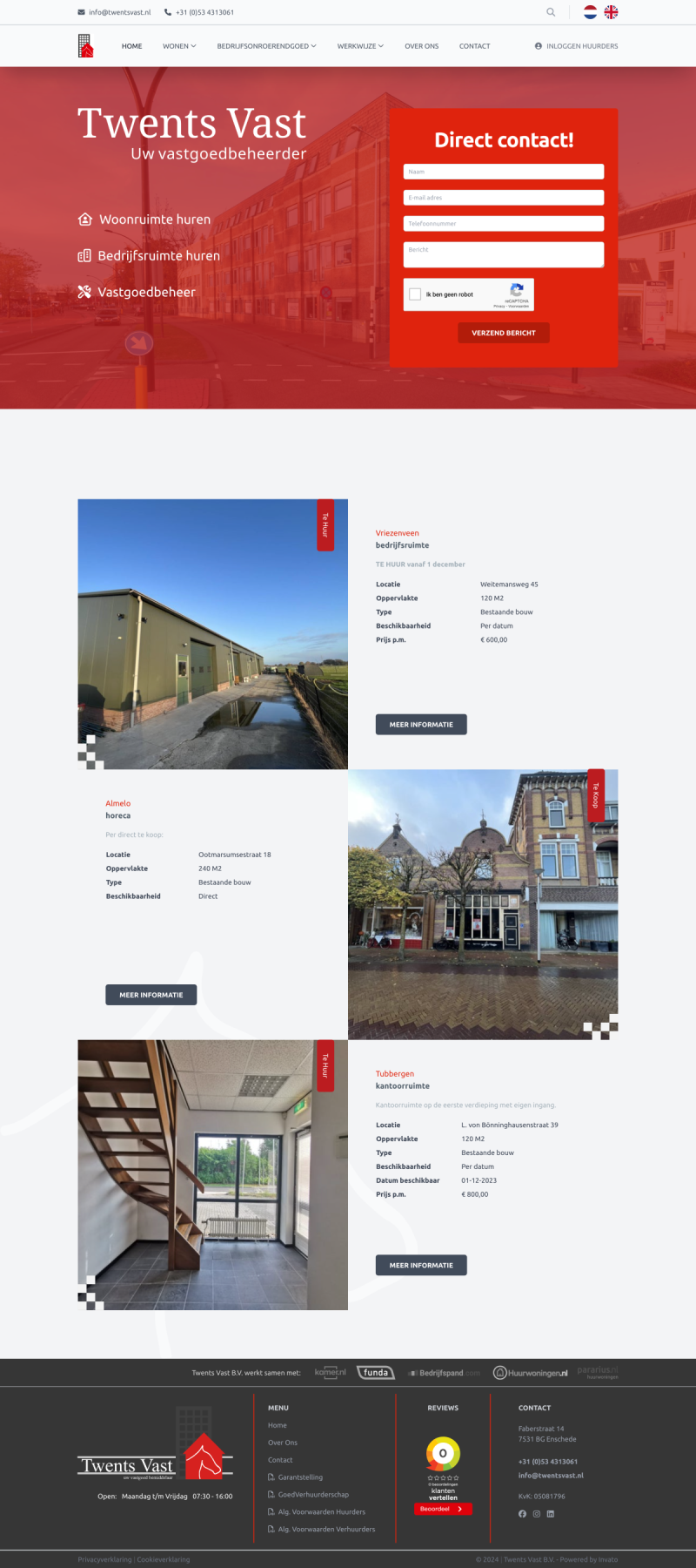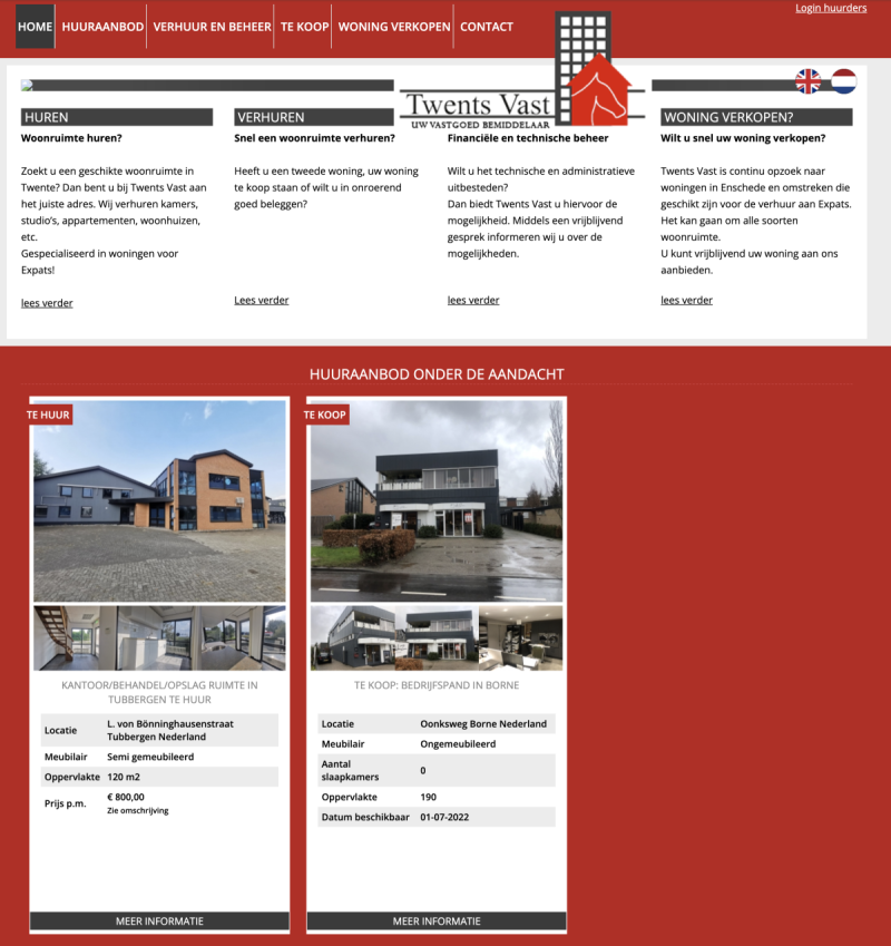 Het eindresultaat: een dynamische en moderne website waarop het vastgoedaanbod van Twents Vast direct vanuit Pararius wordt weergegeven.