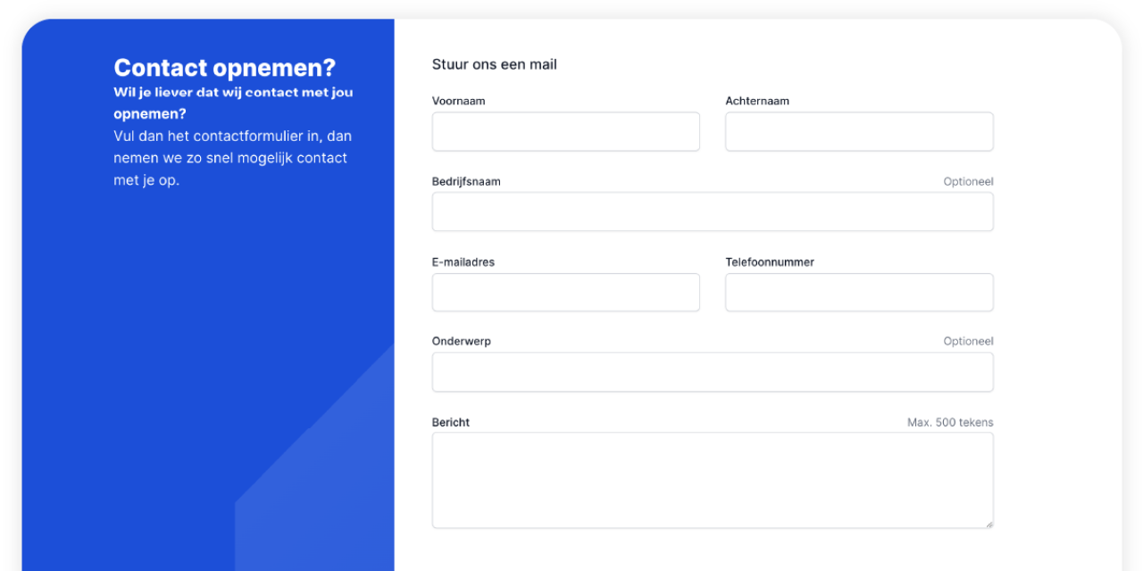 Jouw eigen contactpagina, perfect afgestemd op je bedrijfsstijl. Wij stellen het formulier in zoals jij dat graag wilt hebben. Laat het formulier de rest doen.
