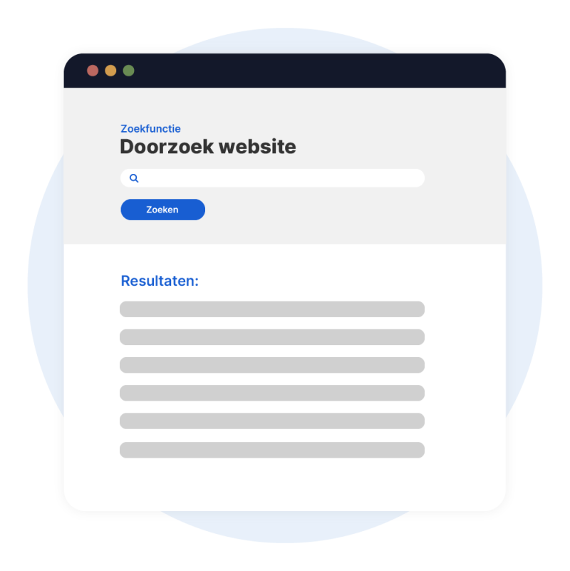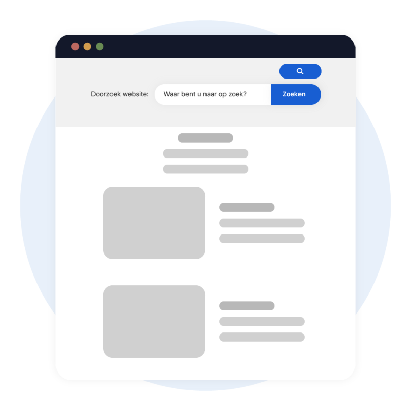 Onze zoekfunctie kan overal op je website worden geplaatst, zoals in het hoofdmenu of in de footer. Deze is altijd direct zichtbaar en toegankelijk voor bezoekers. Ongeacht waar ze zich op je site bevinden, het vinden van wat ze nodig hebben, is slechts een zoekopdracht verwijderd.