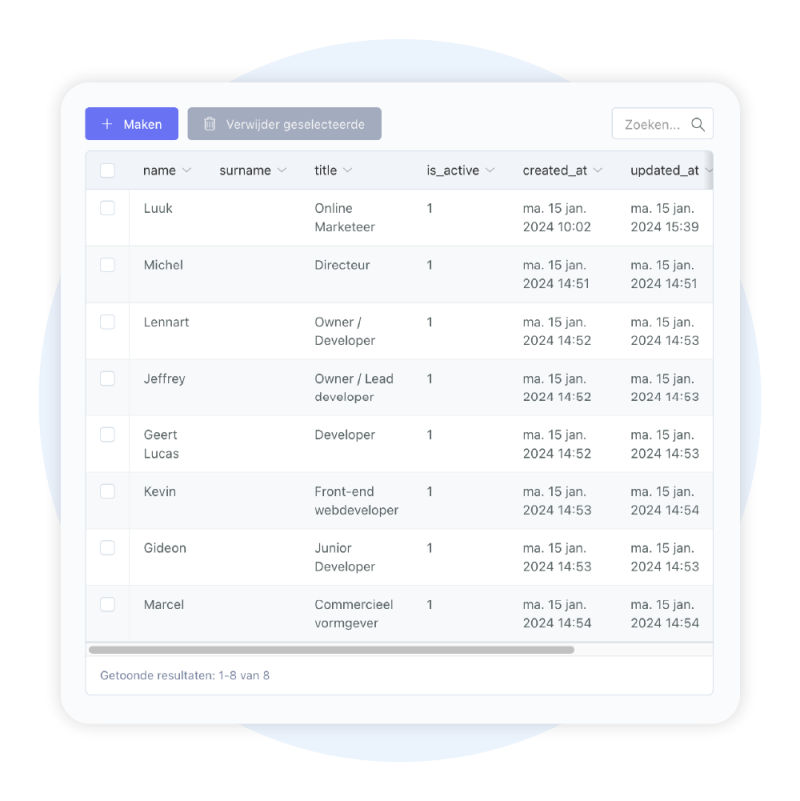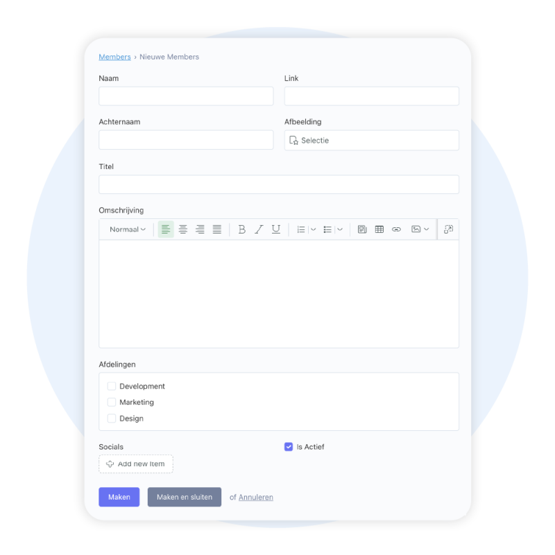 Het toevoegen en beheren van teamleden is uiterst eenvoudig. Met een paar klikken kun je een nieuw teamlid toevoegen, hun informatie invoeren en hun profiel bijwerken. De backend-interface is intuïtief en gebruiksvriendelijk, waardoor het beheren van je teamprofielen moeiteloos verloopt.